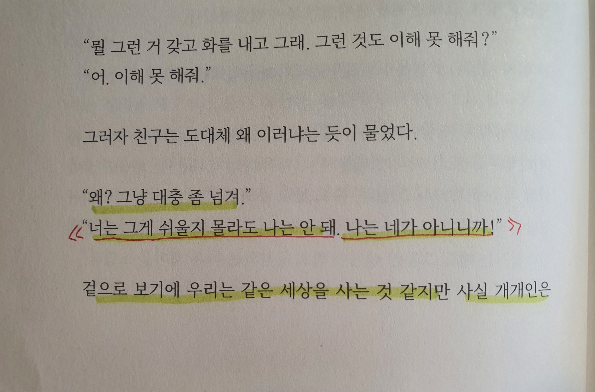 "뭘 그런 거 가지고 그래, 대충 넘어가"라고 말하면서 따지고 표현하는 사람들을 너무 예민하고 피곤한 스타일이라고 생각했던 거 같다. 나에게는 쉽고 대수롭지 않아도 다른 사람에게는 힘든 일이었을 텐데 그저 나 생각만 했었구나! 하는 생각이 들면서 반성하게 되었다. 그리고 내 스스로도 내 감정을 그냥 그렇게 넘겼는지도 모르겠다는 생각이 들었다.