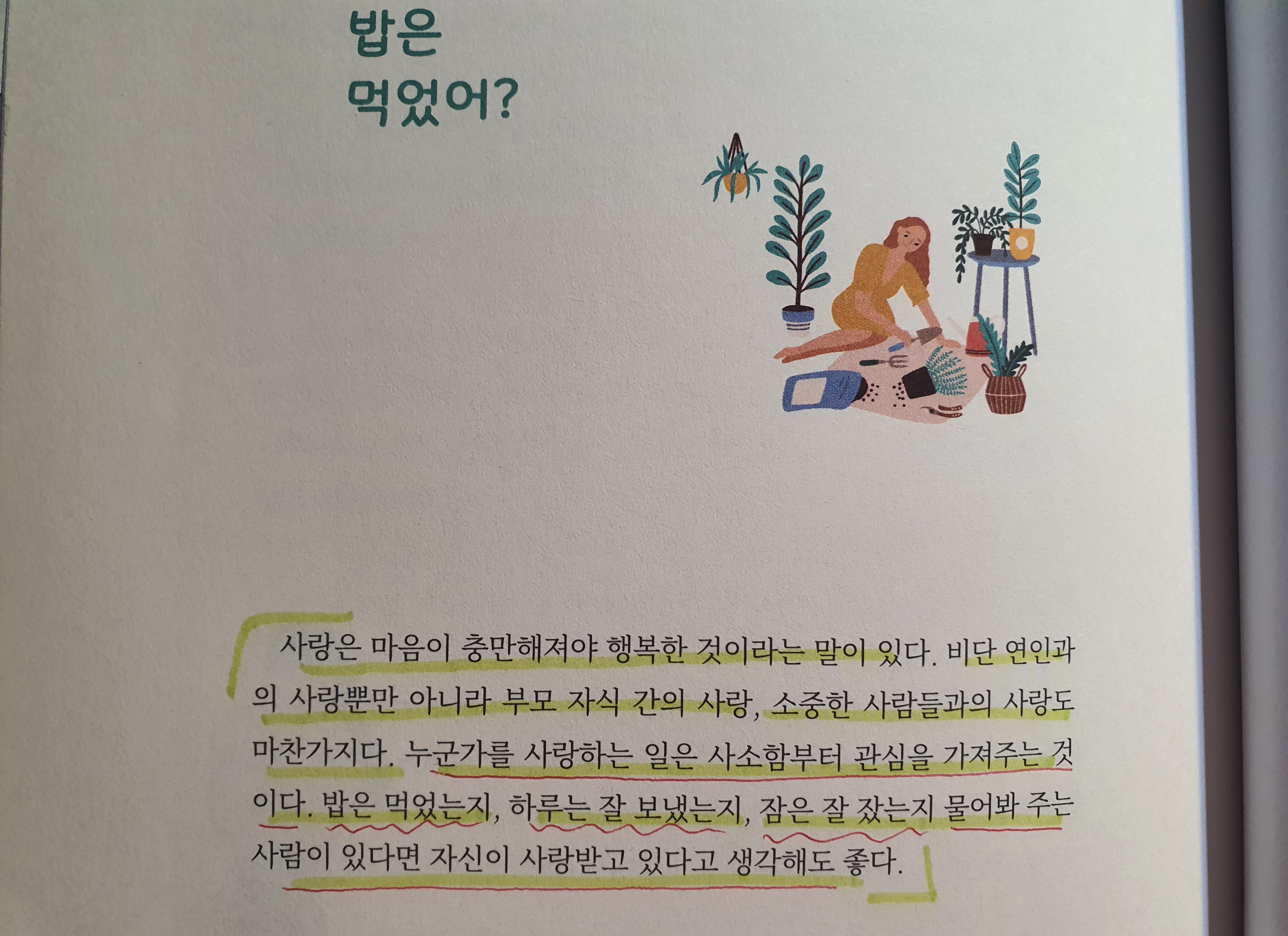사소한 관심, 밥은 먹었는지? 하루를 잘 보냈는지? 잠을 잘 잤는지? 물어봐주는 사람이 있다면 자신이 사랑받고 있다고 생각해도 된다고 한다. 주변에 소중한 사람들에게 사소한 관심을 보이고 표현해보자.