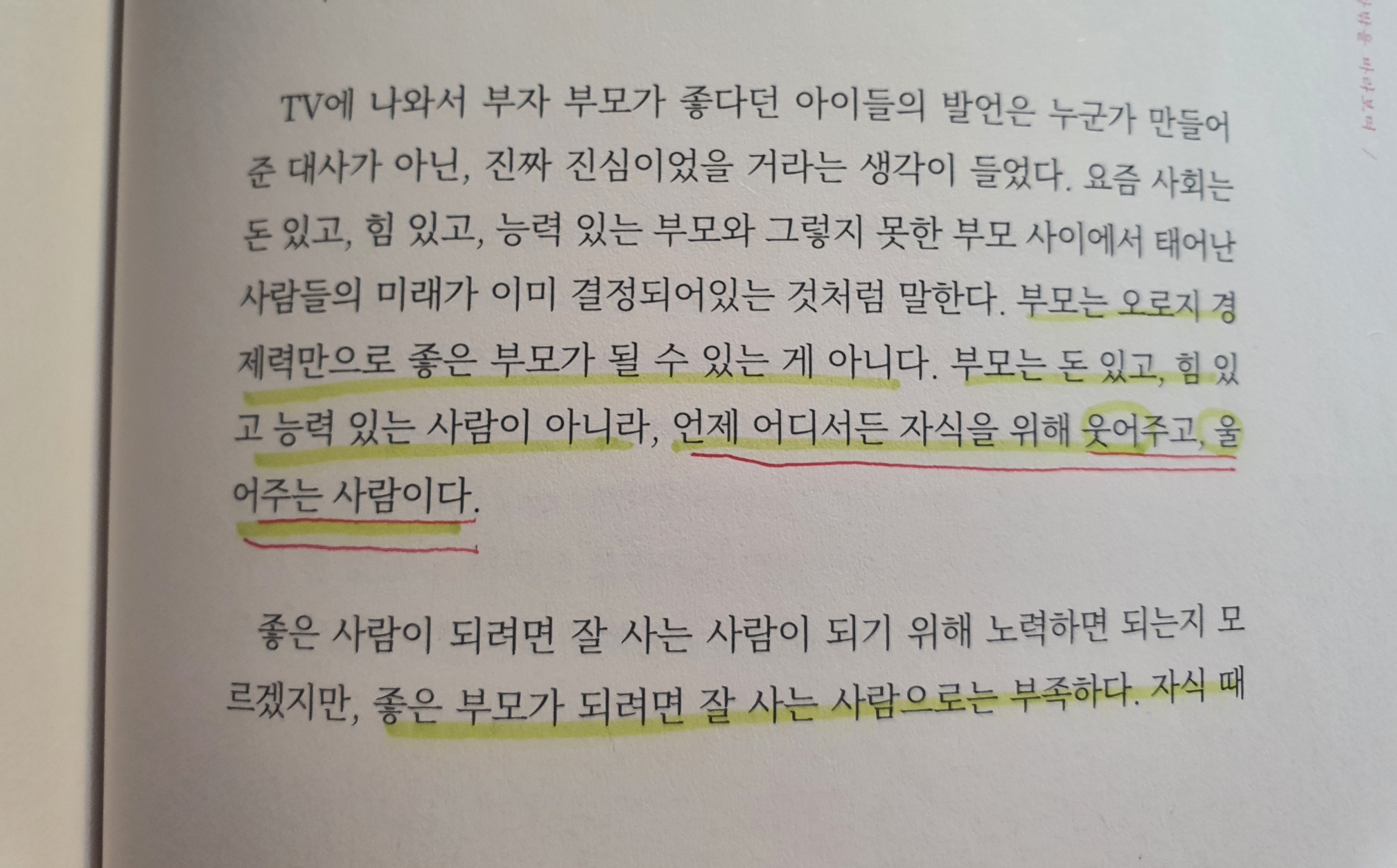 경제적으로 힘이 되어 주는 것도 부모의 큰 역할이지만 그보다는 자녀가 스스로 자립할 수 있도록 도와주고 곁에서 힘이 되어주고 무슨 일이 있어도 너의 편이 되어줄 거라는 믿을 주는 것 또한 중요한 일인 거 같다. 언제 어디서든 자식을 위해 웃어주고, 울어주는 부모가 되어보자. 지금 우리 부모님께서 나에게 해주시는 만큼만이라도 사랑을 줄 수 있었으면 좋겠다.